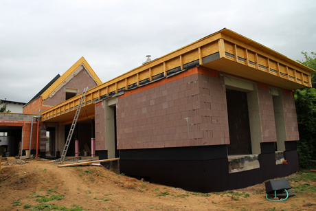 Der auffälligste Baustoff bei der gewählte Bauweise ist der 50cm starke Liapor-Ziegel, der für die Außenwände verwendet wurde. Der Baustoff Liapor besteht aus geblähtem Ton, der mit einem Bindemittel zu Ziegel verarbeitet wird. Ökologisch wertvoll macht dieses Material vor allem der natürliche Baustoff Ton, aber auch der geringe Primärenergieeinsatz bei der Erzeugung.
