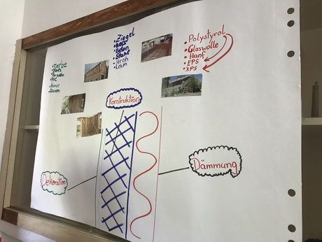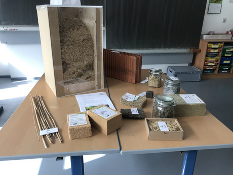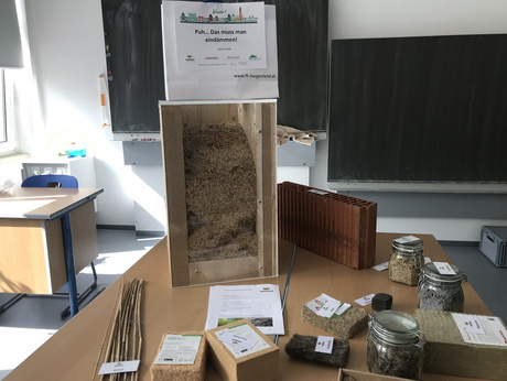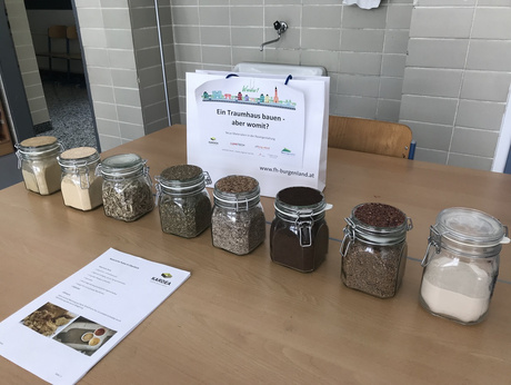 An diesem Projekttag haben wir ökologische Dämmstoffe wie Stroh, Hanf, Flachs usw. anhand von Wandaufbauten und Mustern vorgestellt. Besonderes Interesse erweckten die natürlichen Designputze aus Tee, Kaffee, Zirbe, Lehm usw. Die Schülerinnen und Schüler und auch ihre Eltern konnten die mitgebrachten Proben befühlen und mussten durch Riechen die Inhaltsstoffe erraten.