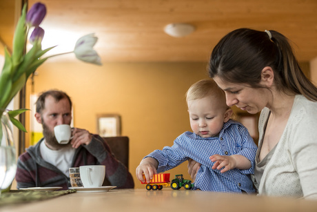 Die Eltern sind beide im Gesundheitsbereich tätig und täglich mit Menschen beschäftigt, die mit gesundheitlichen Problemen zu kämpfen haben. Gerade deshalb ist es ihr Wunsch, ihren Wohnraum so gesund wie möglich zu gestalten. Dachten sie vorher an ein reines Ziegelhaus mit Lehmputz, so hat sie ihre Zeit im KARDEA-Haus vor allem von den Vorzügen von Holz in den Innenräumen überzeugt. Die Decken und Innenwände ihres eigenen Hauses sollen nun ebenfalls aus Holz verwirklicht werden. Ein erstes Resümee von Birgit: „Wir schlafen alle drei hervorragend und merken schon, wie entspannend sich das wohltuende Raumklima auf uns auswirkt. Besonders fällt uns das an Valentin auf. Er ist viel ausgeglichener als in unserer Stadtwohnung. Das liegt sicherlich auch am eigenen Garten, der nun sein Reich ist. Hier kann er Sand spielen, herumtollen und dreht fröhlich mit seinem Dreirad Runde um Runde.“ Und seine Mama hat ihn durch die große Glasfront immer im Blick und kann in Ruhe ihren Kaffee genießen.