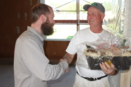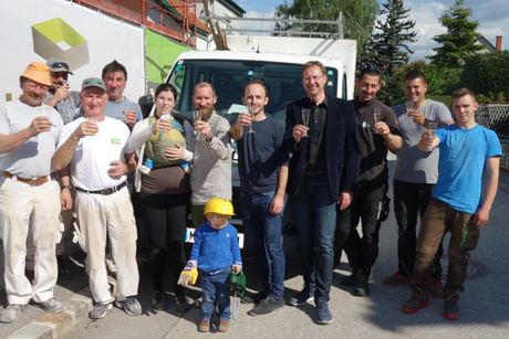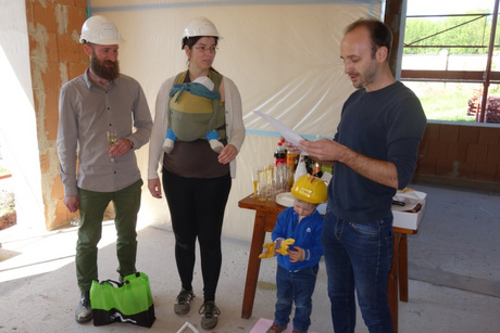 Die Eltern stießen mit der gesamten Mauerer- und Zimmerermannschaft auf die Dachgleiche an. Ein schöner, alter Brauch, der den künftigen Bewohnern Glück und Segen bringen soll.
