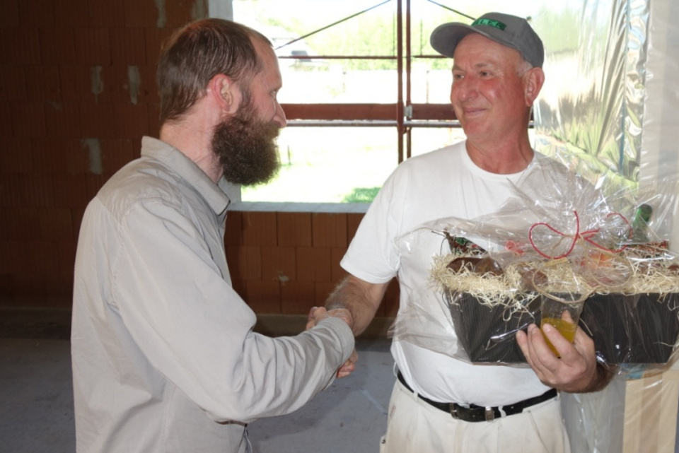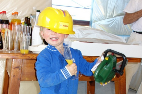 Der kleine Valentin probierte das überbrachte Kinderwerkzeug begeistert aus. Der Helm ist noch etwas zu groß, aber er wird hineinwachsen. Das kleine Geschwisterchen verschlief in Ruhe den ganzen Trubel.